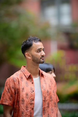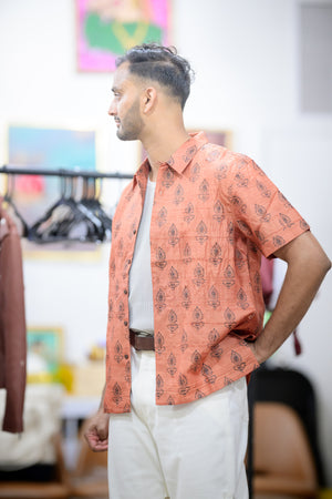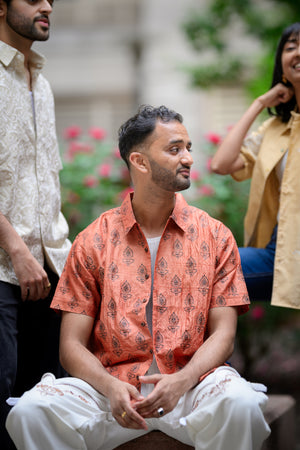 The Amer shirt is a bold take on tradition — crafted from textured raw silk in a rich burnt orange hue. Featuring delicate black butis (motifs) printed throughout, this shirt brings together the rugged beauty of raw silk with graphic elegance. Named after the historic Amer Fort in Rajasthan, its earthy tones and artisanal detail make it a standout piece for festive dressing or everyday edge. It’s statement style with a story — rooted in heritage, reimagined for today.