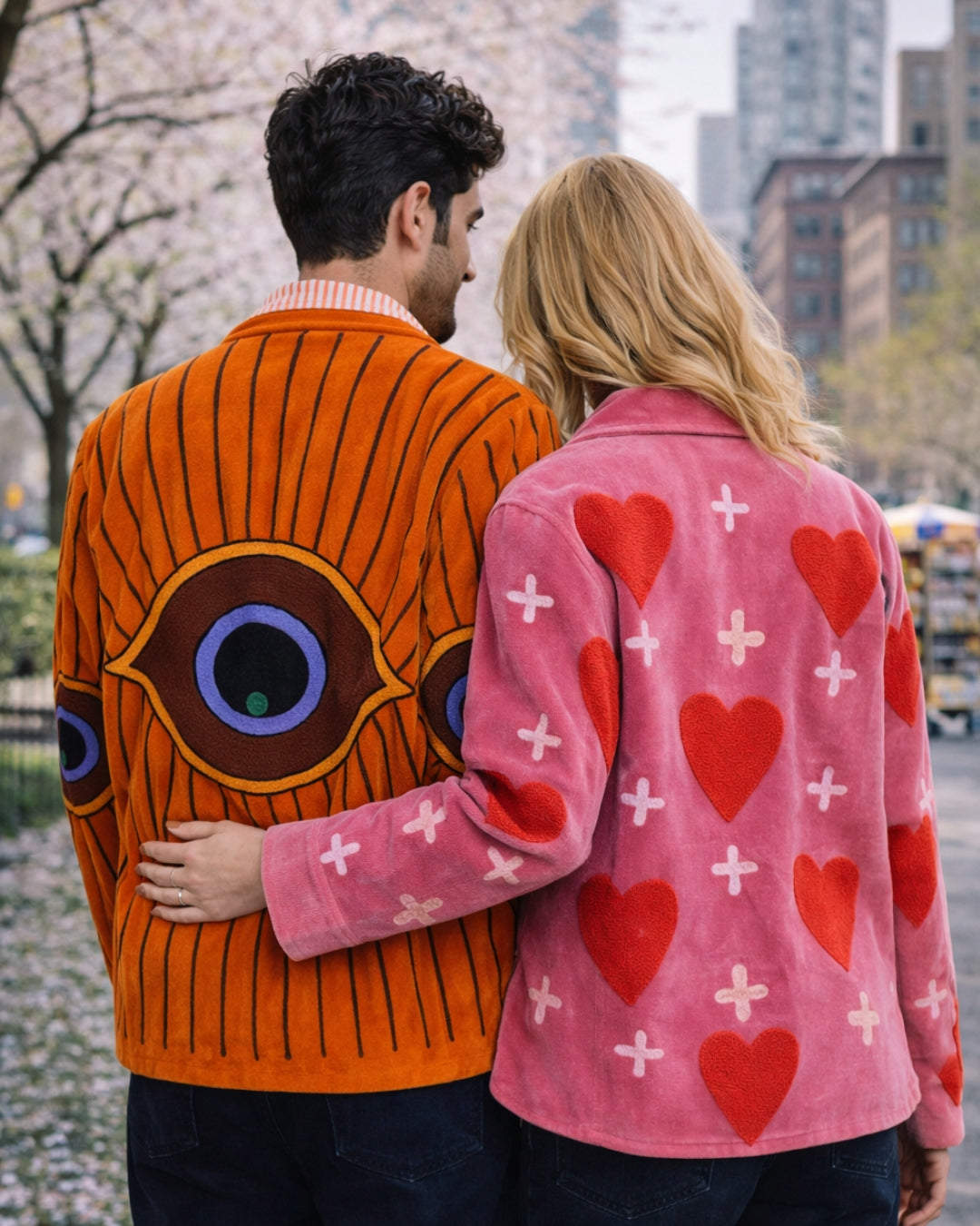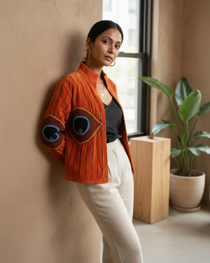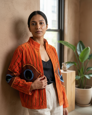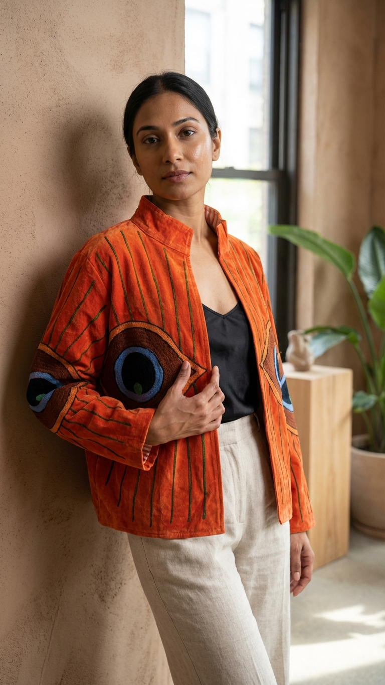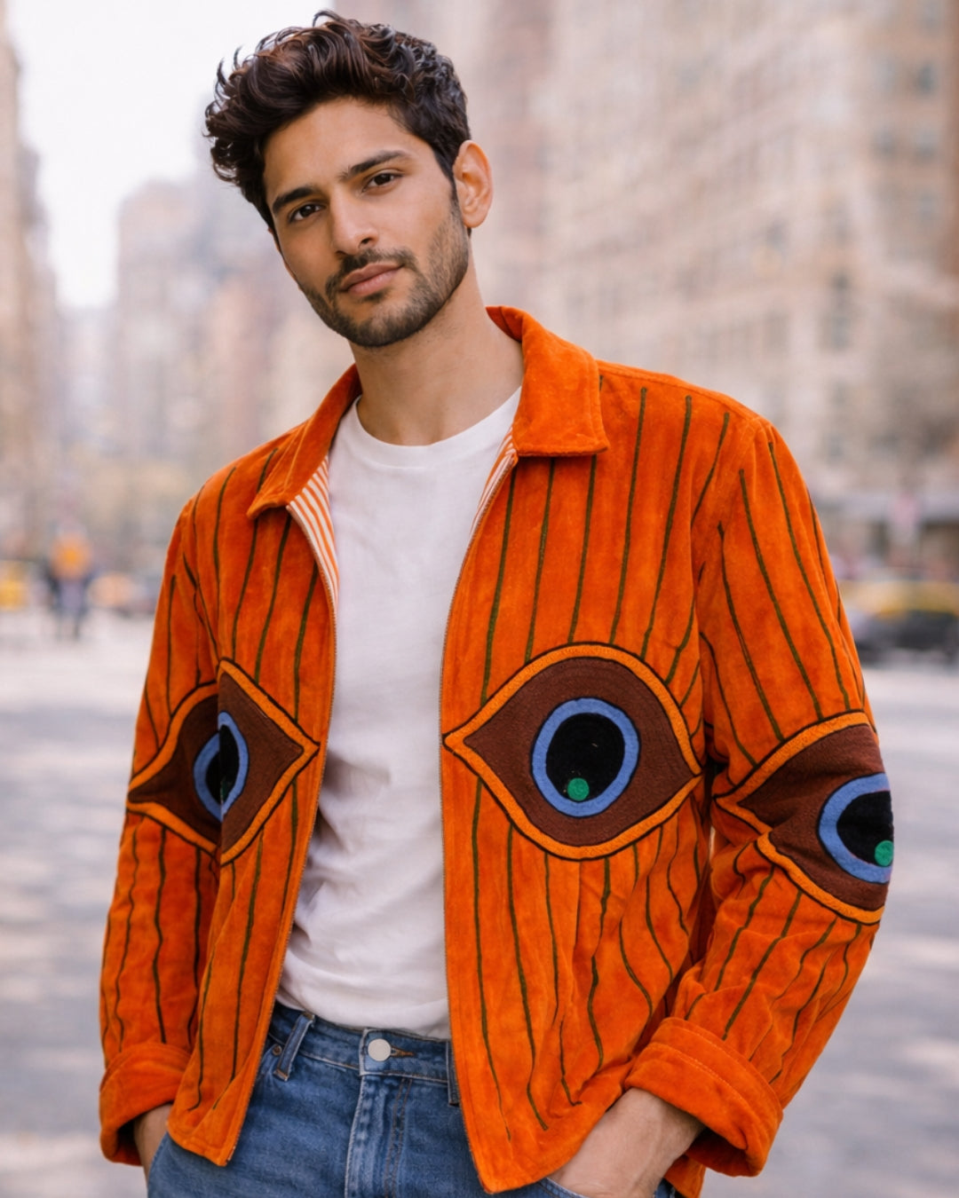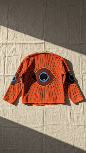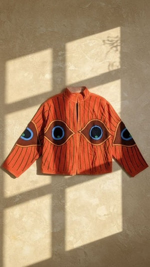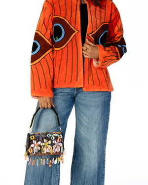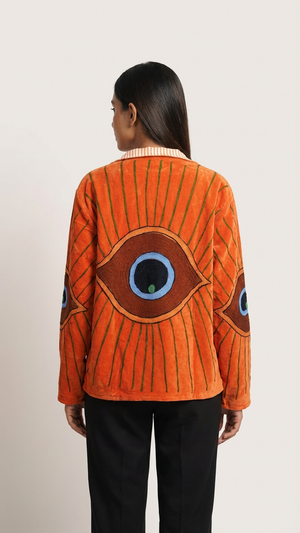 This bright orange velvet statement jacket features embroidered evil eye motifs across a relaxed silhouette designed for easy layering. Vibrant and expressive, it’s a piece that brings energy and character to everyday outfits.