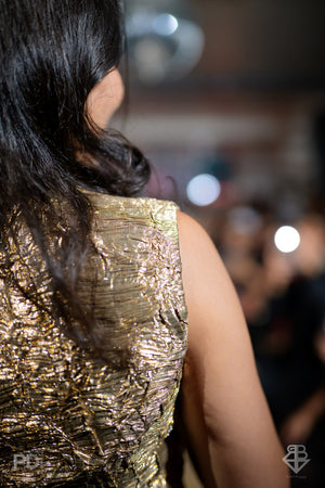 Crafted in crushed gold silk tissue, a sheer and airy textile woven with a natural golden sheen, the vest balances delicacy with boldness — making it the ultimate heritage-meets-modern layering piece.