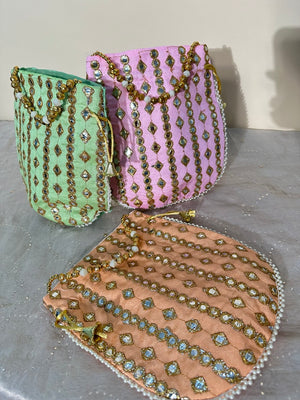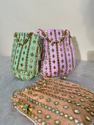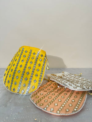 Lightweight yet luxe, this potli is the ultimate festive accessory — perfect for weddings, Diwali parties, or any night out when your look calls for that extra sparkle.