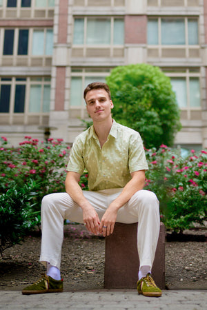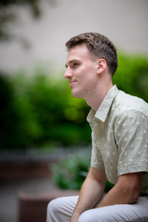 Crafted from luxurious sage green silk, the Rooh shirt features delicate hand-embroidered pearl butis — an homage to the soul of the ocean.