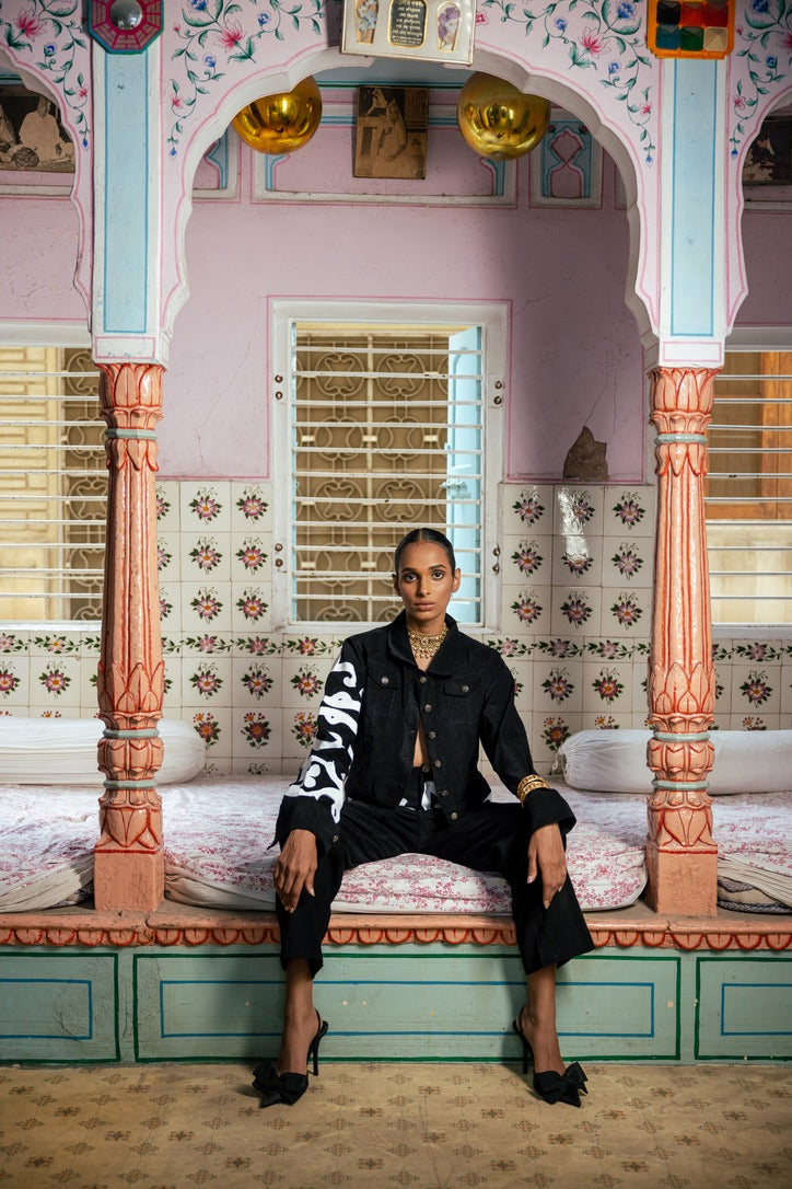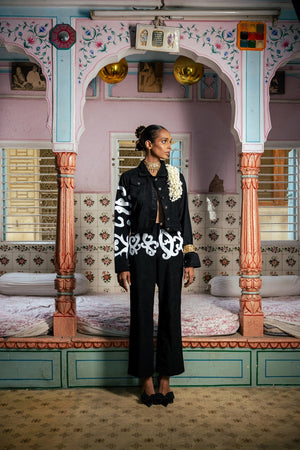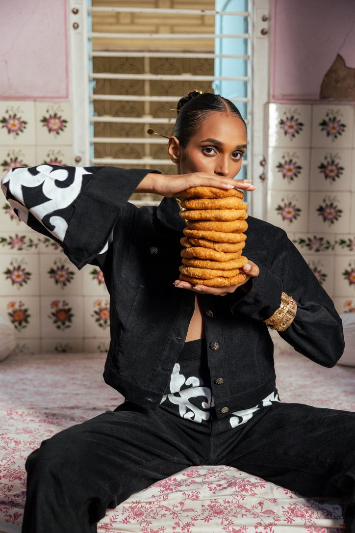Experience the perfect blend of comfort and style with our Jalebi Hand-Painted Pants. Crafted from cotton corduroy with a slight stretch, these cropped, relaxed yet tailored pants feature a stunning hand-painted motif inspired by traditional sari borders. The design runs seamlessly across the front and seat, adding a touch of heritage to a modern silhouette.