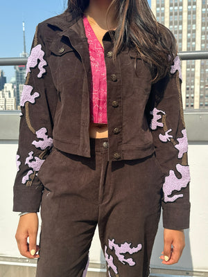 Our signature embroidered jacket combines modern tailoring with exquisite handcrafted details. Featuring over 80 hours of intricate lilac French knot embroidery, this artisan jacket showcases the expertise of our karigars. With a relaxed yet structured fit, this sustainable jacket brings elegance and comfort, making it a versatile statement piece for those seeking ethical fashion and luxury craftsmanship.