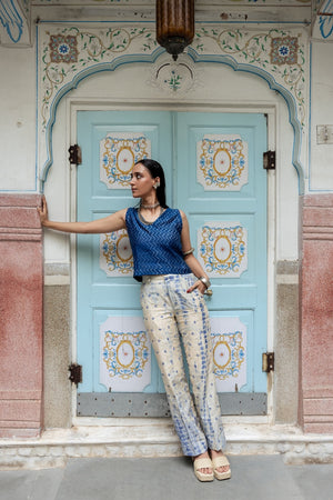 These tie- dyed raw silk pants feature small butis (embroidery motifs) and can be dressed up or down. They fitted through the hips and thighs to offer a flattering fit, while the elasticized wasitband offers comfort and flexibility.