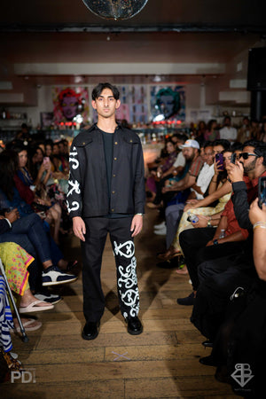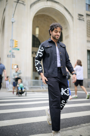 The Jalebi Jacket reimagines classic black denim through the lens of South Asian artistry. Hand-painted with a bold white sari border motif, the design curls and swirls across the fabric like jalebi — playful, graphic, and steeped in tradition.