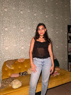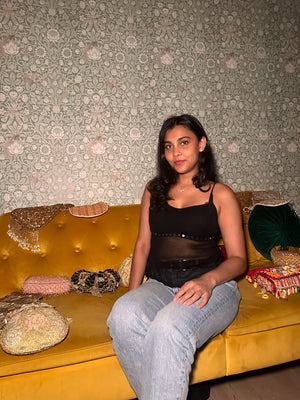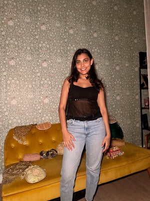 Make your night-out look unforgettable with our Mirror Work Top. Hand-embroidered shisha (mirror) work shimmers against a sheer georgette base, catching the light from every angle. The double-lined bust offers just the right amount of coverage, while the rest of the top remains slightly sheer for a bold, modern edge. Crafted by hand by our artisas, it’s heritage South Asian craft reimagined as the ultimate going-out piece. Pair it with jeans for downtown chic, or with a skirt for festive glam.